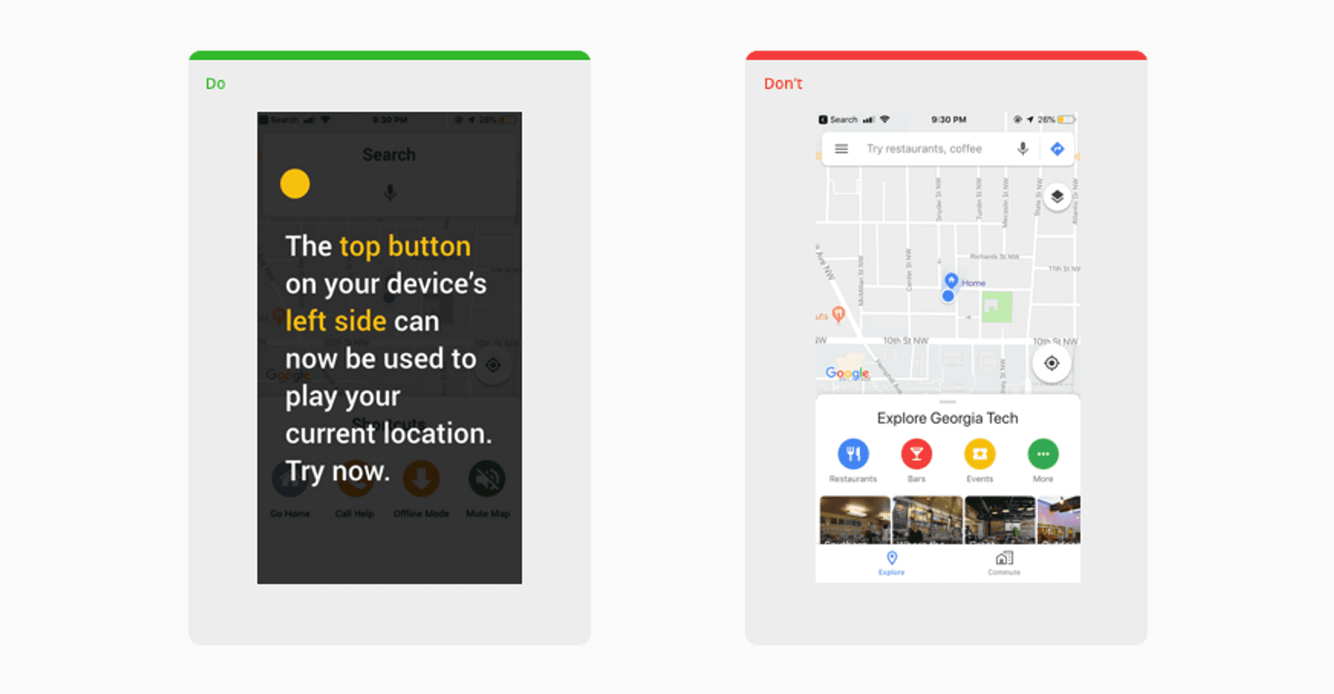 I like the idea of using device buttons rather than screen hot-spots for making mobile maps more accessible – it applies to so many scenarios, not just the visually impaired (think driving)Source: Design Accessible Maps| Phase