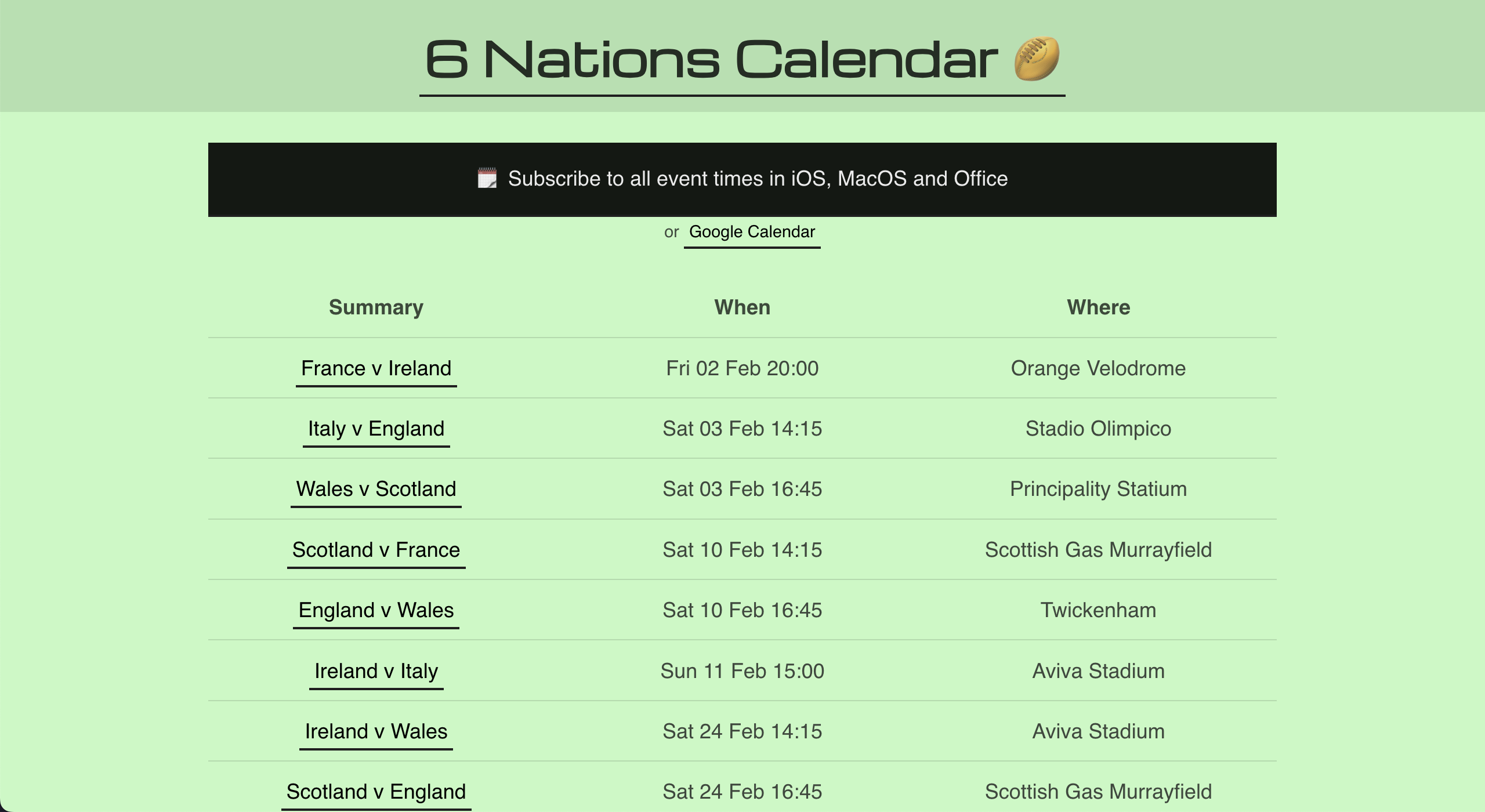 Following the series of sports calendar projects, 6 Nations Calendar provides all the kick off times for the annual 6 Nations competition directly on your own mobile or computer.